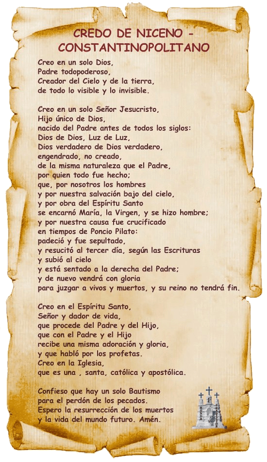 Lo conocemos también como la profesión de nuestra fe. El Credo es la oración que recitamos cada domingo después de escuchar la homilía del Sacerdote en relación a las lecturas del día. En algunas ocasiones se sustituye por la renovación de las promesas bautismales, esto según lo considere el celebrante.