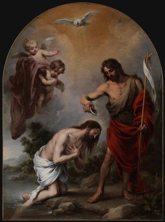 El bautismo de Cristo. Esta obra, que se halla colocada en el ático o remate del retablo de la capilla de San Antonio de la catedral de Sevilla, (España), fue pintada hacia el año 1668, Bartolomé Esteban Murillo