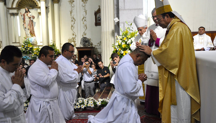 En el grado inferior de la jerarquía están los diáconos, a los que se les imponen las manos «para realizar un servicio y no para ejercer el sacerdocio»» (LG 29; cf CD 15). En la ordenación al diaconado, sólo el obispo impone las manos, significando así que el diácono está especialmente vinculado al obispo en las tareas de su «diaconía» (cf San Hipólito Romano, Traditio apostolica 8)