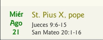 En aquel tiempo, dijo Jesús a sus discípulos esta parábola: «El Reino de los Cielos se parece a un propietario que al amanecer salió a contratar jornaleros para su viña. Después de ajustarse con ellos en un denario por jornada, los mandó a la viña. Salió otra vez a media mañana, vio a otros que estaban en la plaza sin trabajo, y les dijo: –Id también vosotros a mi viña y os pagaré lo debido. Ellos fueron. Salió de nuevo hacia mediodía y a media tarde e hizo lo mismo. Salió al caer la tarde y encontró a otros, parados, y les dijo: –¿Cómo es que estáis aquí el día entero sin trabajar? Le respondieron: –Nadie nos ha contratado. El les dijo: –Id también vosotros a mi viña. Cuando oscureció, el dueño dijo al capataz: –Llama a los jornaleros y págales el jornal, empezando por los últimos y acabando por los primeros. Vinieron los del atardecer y recibieron un denario cada uno. Cuando llegaron los primeros, pensaban que recibirían más, pero ellos también recibieron un denario cada uno. Entonces se pusieron a protestar contra el amo: –Estos últimos han trabajado sólo una hora y los has tratado igual que a nosotros, que hemos aguantado el peso del día y el bochorno. El replicó a uno de ellos: –Amigo, no te hago ninguna injusticia. ¿No nos ajustamos en un denario? Toma lo tuyo y vete. Quiero darle a este último igual que a ti. ¿Es que no tengo libertad para hacer lo que quiera en mis asuntos? ¿O vas a tener tú envidia porque yo soy bueno? Así, los últimos serán los primeros y los primeros los últimos».