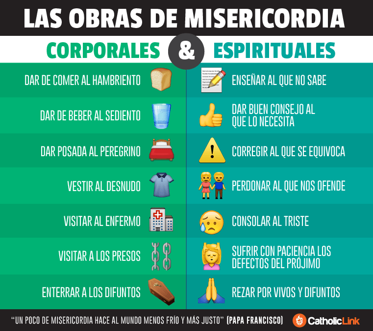 son acciones caritativas mediante las cuales ayudamos a nuestro prójimo en sus necesidades corporales y espirituales (cf. Is 58, 6-7; Hb 13, 3). Instruir, aconsejar, consolar, confortar, son obras espirituales de misericordia, como también lo son perdonar y sufrir con paciencia. Las obras de misericordia corporales consisten especialmente en dar de comer al hambriento, dar techo a quien no lo tiene, vestir al desnudo, visitar a los enfermos y a los presos, enterrar a los muertos (cf Mt 25,31-46).