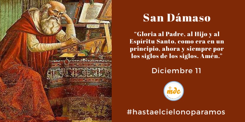 Lo que se conoce de su vida es, sobre todo, a partir de su elección al pontificado, que ejerció durante algo más de 18 años. Fue un firme y decidido defensor del primado de Pedro y le tocó defenderse, primero, de su rival Ursino, que le disputó la sede de Roma. Tuvo que afrontar también movimientos heréticos, y fue muy cauto en relación con las personas que los sostenían, convocando concilios para ratificar la sana doctrina en los años 371, 374 y, sobre todo, el del año 382 para solucionar los problemas con la Iglesia oriental, solicitado por san Ambrosio de Milán (7 dic.). A él acudió san Jerónimo (30 sep.), que así tuvo ocasión de tratar con el anciano papa Dámaso, el cual quedó impresionado por la cultura bíblica de Jerónimo. Por eso le encargó preparar un texto fidedigno de la Biblia en latín, la conocida Vulgata. El papa Dámaso era muy culto; tenía una buena biblioteca. De niño había oído referir los heroicos martirios de los cristianos, le habían impresionado vivamente, y no quiso que se perdiera su recuerdo. Fue testigo de la construcción de las grandes basílicas por el emperador Constantino, y sabía que en el subsuelo de Roma se escondían las reliquias de muchos mártires, por lo que promovió obras que facilitaran el acceso a las catacumbas y emprendió la tarea de localizar fidedignamente sus sepulcros. Por su parte, escribió los famosos Epigramas sobre muchos de ellos.