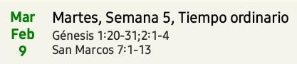 EN aquel tiempo, se reunieron junto a Jesús los fariseos y algunos escribas venidos de Jerusalén; y vieron que algunos discípulos comían con manos impuras, es decir, sin lavarse las manos. (Pues los fariseos, como los demás judíos, no comen sin lavarse antes las manos, restregando bien, aferrándose a la tradición de sus mayores, y al volver de la plaza no comen sin lavarse antes, y se aferran a otras muchas tradiciones, de lavar vasos, jarras y ollas).