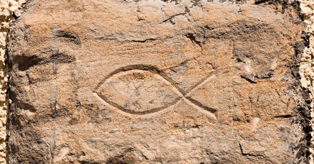 El pez. En griego se dice «IXTHYS» (Ijzýs). Puestas en vertical, estas letras forman un acróstico: «Iesús Jristós, Zeú Yiós, Sotér» = Jesucristo, Hijo de Dios, Salvador. Acróstico es una palabra griega que significa la primera letra de cada línea o párrafo. Es un símbolo muy difundido de Cristo, emblema y compendio de la fe cristiana.