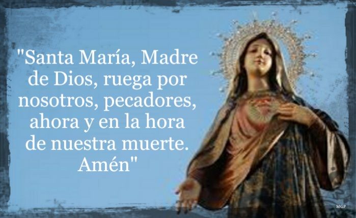 “Ruega por nosotros, pecadores, ahora y en la hora de nuestra muerte”. Pidiendo a María que ruegue por nosotros, nos reconocemos pecadores y nos dirigimos a la “Madre de la Misericordia”, a la Toda Santa. Nos ponemos en sus manos “ahora”, en el hoy de nuestras vidas. Y nuestra confianza se ensancha para entregarle desde ahora, “la hora de nuestra muerte”. Que esté presente en esa hora, como estuvo en la muerte en Cruz de su Hijo, y que en la hora de nuestro tránsito nos acoja como madre nuestra (cf Jn 19, 27) para conducirnos a su Hijo Jesús, al Paraíso