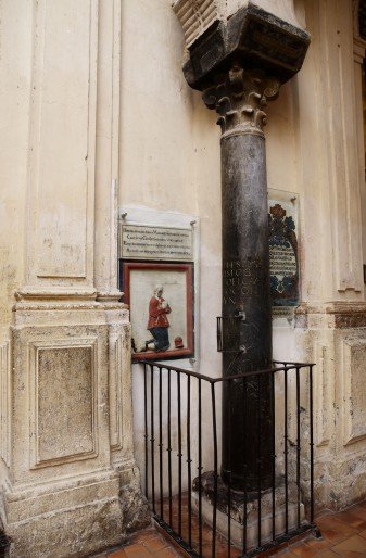 Catedral de Córdoba, columna donde fue atado un cristiano, nuestras que está era mezquita, en donde tallo con sus uñas una Cruz