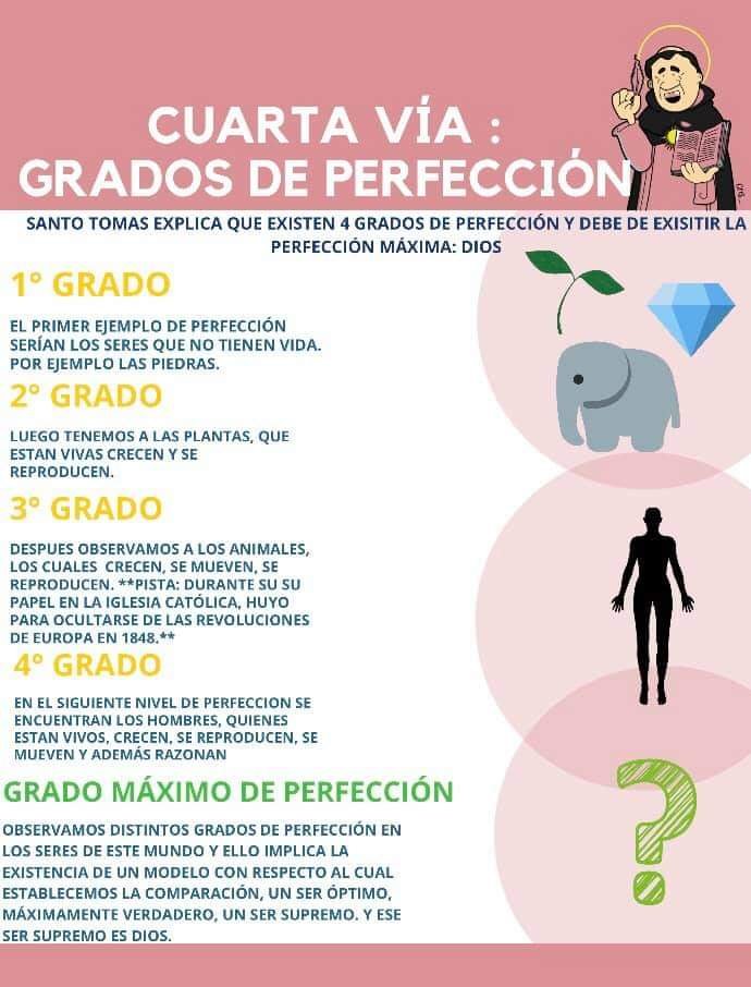 Respuesta: Esta objeción demuestra nuevamente una completa ignorancia acerca del trasfondo metafísico en que se basa esta vía tomista. Y es que aquí el santo, al examinar los diversos grados de perfección en las cosas, no está partiendo de cualquier “más o menos”, sino de las perfecciones “simples” o “puras”, que indican cualidades absolutamente perfectas en su misma esencia y noción, sin posibilidad de defecto. De este modo, este tipo perfecciones deben entenderse como opuestas a las “mixtas” o “compuestas”, que contienen necesariamente deficiencias en su propio ser y concepto. Clara muestra de que en la presente vía Santo Tomás de Aquino toma como punto de partida el primer tipo de perfecciones y no el segundo es que comienza nombrando perfecciones puras tales como la bondad, la verdad y la nobleza (belleza) e inmediatamente luego de decirnos que se presentan en distintos grados en los seres añade que “lo mismo sucede con las demás perfecciones de este tipo” (6). Ahora bien, ¿qué tipo de perfecciones son las propias de la “mole corpórea” (como son las que refiere la objeción con los ejemplos de la “gran estrella” y el “gran elefante africano”)? Pues obviamente del segundo tipo. Y es que la cantidad, el tamaño y la vastedad espacial implican necesariamente imperfección, composición y defecto desde su propia definición y concepto pues no pueden darse nunca de modo ilimitado. Así, por ejemplo, es absurdo pensar en un cuerpo infinitamente grande dado que todo cuerpo implica medida y, por tanto, límite. Y no solo eso. Postular tal cosa como un cuerpo infinitamente grande (o, si se quiere, un universo espacialmente infinito) puede llevarnos a varios absurdos lógicos como el sostener que si desapareciera la mitad de dicho cuerpo quedaría todavía una cantidad infinita de este, es decir, ¡tanto como al comienzo!