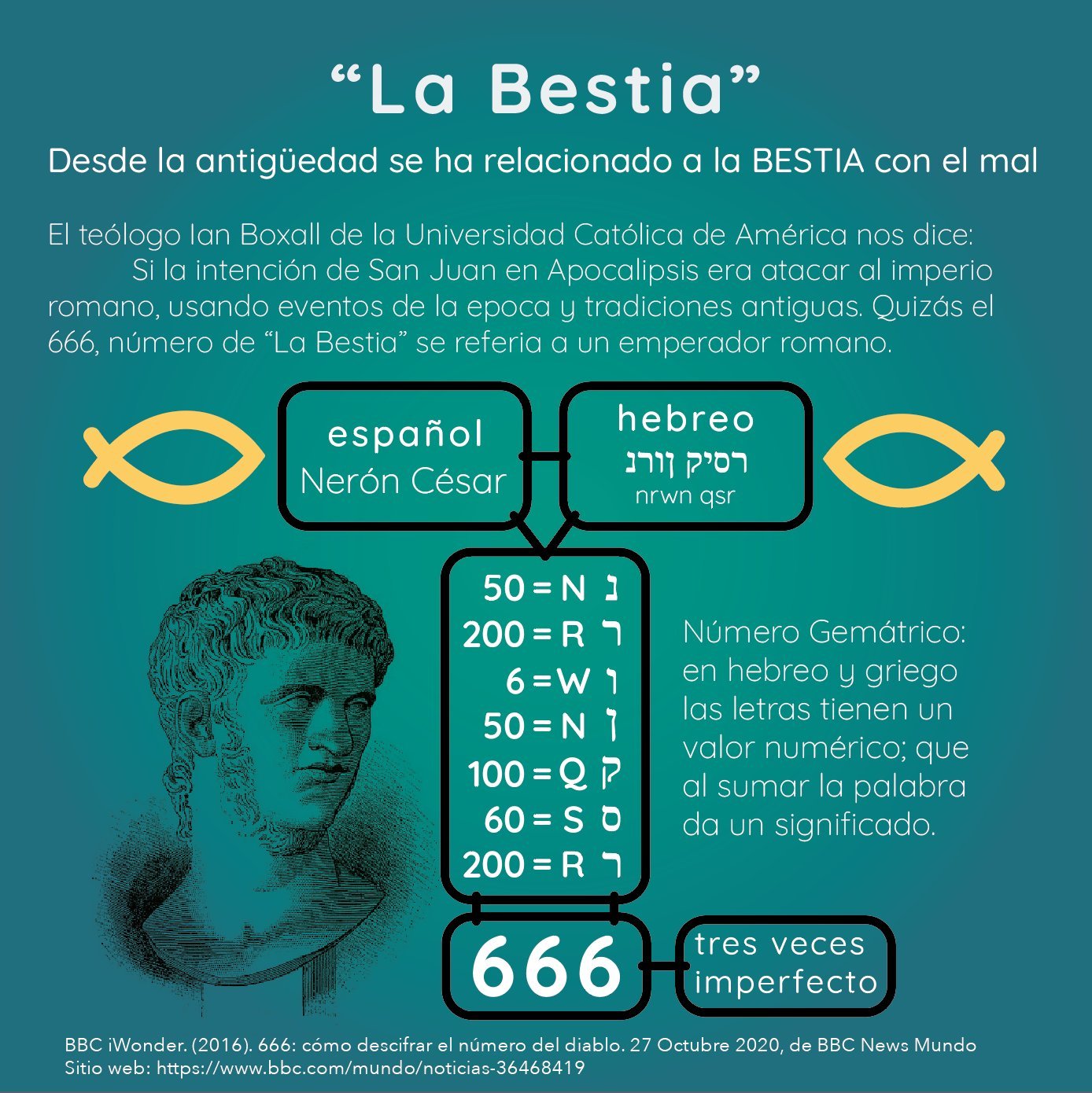 El criptograma 666 bajo este contexto En tiempos de persecución, resultaba muy prudente, aprovechando lo simbólico del género apocalíptico, echar mano a un símbolo numérico para referirse al opresor. Hay que recordar además que el 6 es un número usado para representar la imperfección, por quedar detrás del 7, la plenitud. El hecho de repetir tres veces el 6, resulta significativo, pues 3 es símbolo de perfección. Repetir tres veces un adjetivo equivale al máximo superlativo posible.