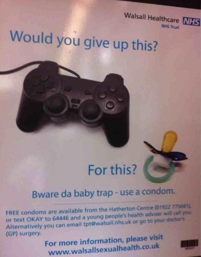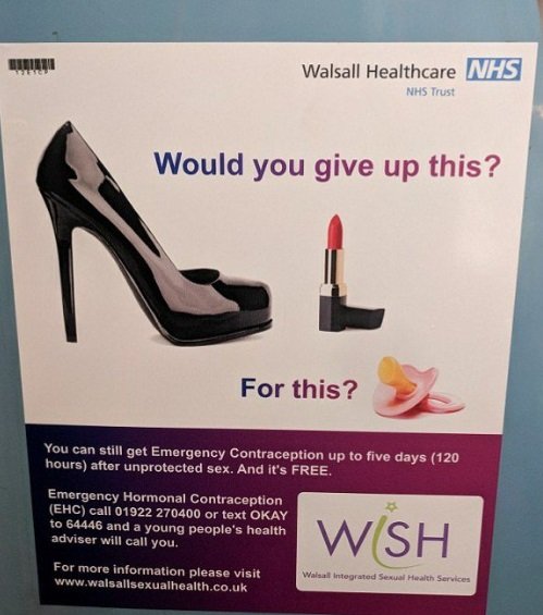 El National Health Service (Servicio Nacional de Salud) es el sistema sanitario público de Gran Bretaña e Irlanda del Norte. La suborganización del NHS «Walsall Healthcare NHS Trust» causó un gran revuelo en septiembre de 2018 cuando lanzó una campaña de anticoncepción en la que preguntaba a mujeres y hombres si querían renunciar a los supuestos «beneficios» de no tener hijos: «¿ Renunciarías a esto?» (imagen de tacones y lápiz labial para las mujeres / mando de PlayStation para los hombres) «…¿ Por esto?» (imagen de un chupón).