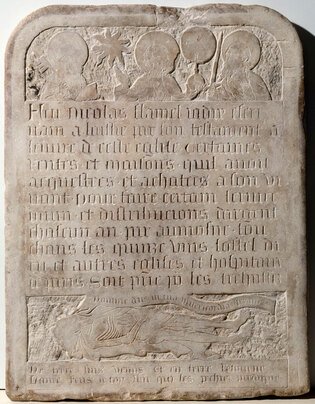El difunto Nicolás Flamel, antes escritor, dejó para trabajar para esta iglesia ciertas rentas y casas que había adquirido y comprado durante su vida para realizar ciertos servicios divinos y distribuciones de dinero cada año por limosnas relacionadas con el Quinze Vingt, el Hôtel Dieu y otras iglesias y hospitales de París. Se rece aquí a los difuntos».