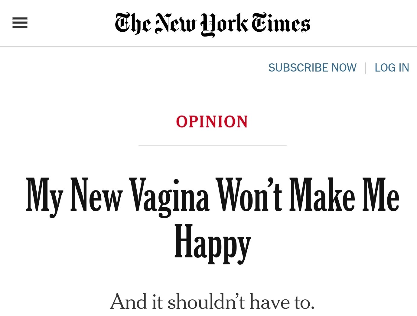 El día domingo 25 de noviembre de 2018, el conocido diario The New York Times publicó un artículo de opinión titulado: “Cirugía, hormonas, pero sin felicidad” (“ Surgery, Hormones, But Not Happiness”). La edición digital fue más crasa: “Mi nueva vªgįnâ no va a hacerme feliz” (“ My New vªgįnâ Won’t Make Me Happy”).