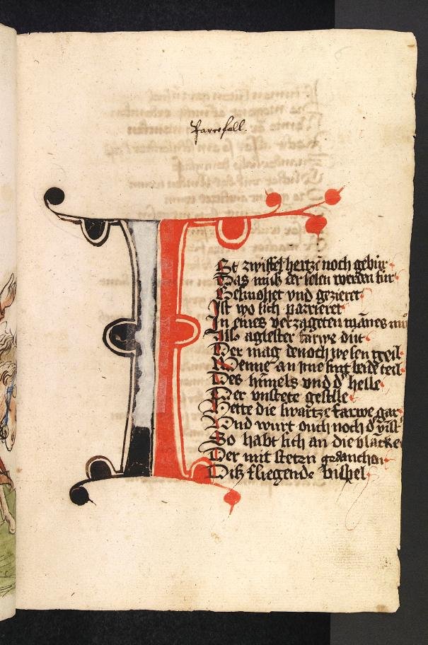 Wolfram, Parzival 1,1ss (prólogo). Primera línea: Ist zwiffel hertzen noch gebur… (Biblioteca universitaria de Heidelberg, Codex Palatinus Germanicus, 339, fol. 6r).