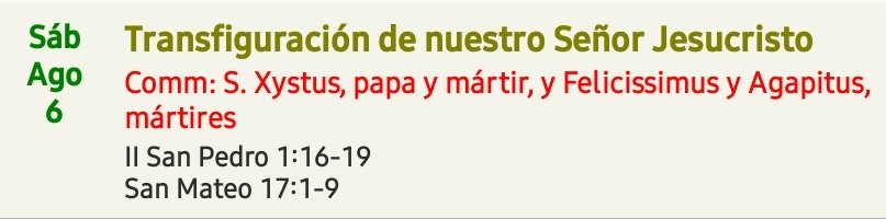 Seis días después, toma Jesús consigo a Pedro, a Santiago y a su hermano Juan, y los lleva aparte, a un monte alto. Y se transfiguró delante de ellos: su rostro se puso brillante como el sol y sus vestidos se volvieron blancos como la luz. En esto, se les aparecieron Moisés y Elías que conversaban con él. Tomando Pedro la palabra, dijo a Jesús: «Señor, bueno es estarnos aquí. Si quieres, haré aquí tres tiendas, una para ti, otra para Moisés y otra para Elías.» Todavía estaba hablando, cuando una nube luminosa los cubrió con su sombra y de la nube salió una voz que decía: «Este es mi Hijo amado, en quien me complazco; escuchadle.» Al oír esto los discípulos cayeron rostro en tierra llenos de miedo Mas Jesús, acercándose a ellos, los tocó y dijo: «Levantaos, no tengáis miedo.» Ellos alzaron sus ojos y no vieron a nadie más que a Jesús solo. Y cuando bajaban del monte, Jesús les ordenó: «No contéis a nadie la visión hasta que el Hijo del hombre haya resucitado de entre los muertos.»