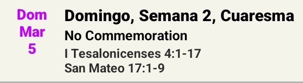 Seis días después, toma Jesús consigo a Pedro, a Santiago y a su hermano Juan, y los lleva aparte, a un monte alto. Y se transfiguró delante de ellos: su rostro se puso brillante como el sol y sus vestidos se volvieron blancos como la luz. En esto, se les aparecieron Moisés y Elías que conversaban con él. Tomando Pedro la palabra, dijo a Jesús: «Señor, bueno es estarnos aquí. Si quieres, haré aquí tres tiendas, una para ti, otra para Moisés y otra para Elías.» Todavía estaba hablando, cuando una nube luminosa los cubrió con su sombra y de la nube salió una voz que decía: «Este es mi Hijo amado, en quien me complazco; escuchadle.» Al oír esto los discípulos cayeron rostro en tierra llenos de miedo Mas Jesús, acercándose a ellos, los tocó y dijo: «Levantaos, no tengáis miedo.» Ellos alzaron sus ojos y no vieron a nadie más que a Jesús solo. Y cuando bajaban del monte, Jesús les ordenó: «No contéis a nadie la visión hasta que el Hijo del hombre haya resucitado de entre los muertos.»