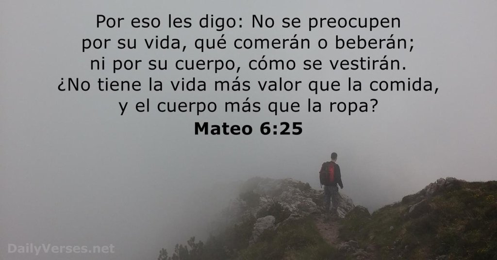 Evangelio según san Mateo, 6: 25- 25 «Por lo tanto os digo: No andéis afanados para vuestra alma qué comeréis, ni para vuestro cuerpo qué vestiréis. No es más el alma que la comida yel cuerpo más que el vestido?» (v. 25)
