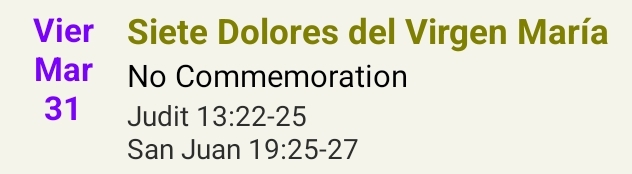 Junto a la cruz de Jesús estaban su madre y la hermana de su madre, María, mujer de Clopás, y María Magdalena. Jesús, viendo a su madre y junto a ella al discípulo a quien amaba, dice a su madre: «Mujer, ahí tienes a tu hijo.» Luego dice al discípulo: «Ahí tienes a tu madre.» Y desde aquella hora el discípulo la acogió en su casa.