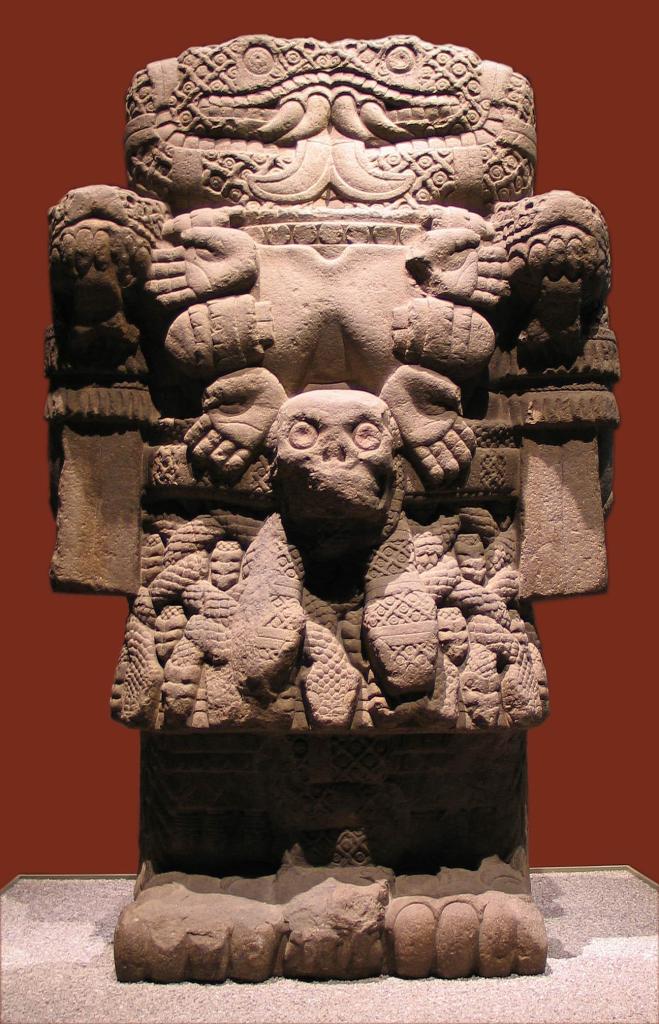 La representación de la diosa- madre Coatlicué, es una obra premonitoria de la cultura del aborto: descubierta en 1790 en la ciudad de México, tiene 2 metros de alto y pesa 12 toneladas: «su cabeza está formada por el extraño acoplamiento de dos cabezas; en lugar de manos tiene patas de jaguar y sus pies son garras de águila. Se muestra degollada, como las mujeres sacrificadas en los.ritos de fecundidad; de su garganta abierta saltan chorros de sangre que representan dos serpientes. Tiene un collar, compuesto por manos y termina en una calavera y su falda está formada por víboras trenzadas». Como es natural pensar, este tipo de culto (¿encubierto?) al demonio hacia que la cultura misma estuviese en decadencia y que tuviesen «menos adquisiciones científicas que los griegos del siglo V antes de Cristo». En fin, un mundo no tan feliz, todo estaba más o menos así hasta que llegaron los europeos..