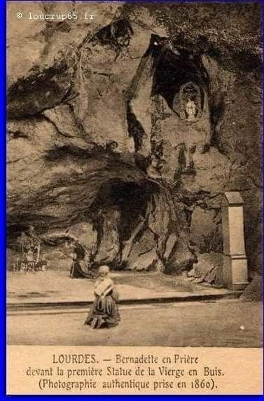 LOURDES. – Bernadette en oración frente a la primera Estatua de la Virgen (Fotografía auténtica tomada en 1860)