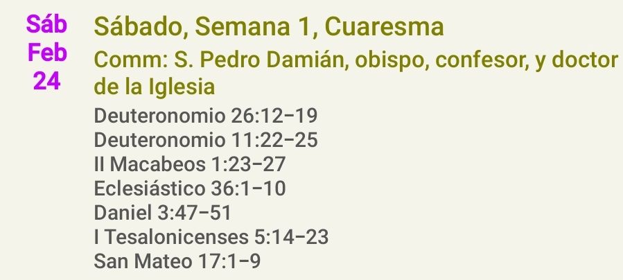 Seis días después, toma Jesús consigo a Pedro, a Santiago y a su hermano Juan, y los lleva aparte, a un monte alto. Y se transfiguró delante de ellos: su rostro se puso brillante como el sol y sus vestidos se volvieron blancos como la luz. En esto, se les aparecieron Moisés y Elías que conversaban con él. Tomando Pedro la palabra, dijo a Jesús: «Señor, bueno es estarnos aquí. Si quieres, haré aquí tres tiendas, una para ti, otra para Moisés y otra para Elías.» Todavía estaba hablando, cuando una nube luminosa los cubrió con su sombra y de la nube salió una voz que decía: «Este es mi Hijo amado, en quien me complazco; escuchadle.» Al oír esto los discípulos cayeron rostro en tierra llenos de miedo Mas Jesús, acercándose a ellos, los tocó y dijo: «Levantaos, no tengáis miedo.» Ellos alzaron sus ojos y no vieron a nadie más que a Jesús solo. Y cuando bajaban del monte, Jesús les ordenó: «No contéis a nadie la visión hasta que el Hijo del hombre haya resucitado de entre los muertos.»