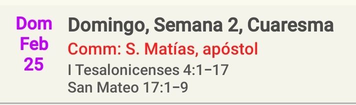 Seis días después, toma Jesús consigo a Pedro, a Santiago y a su hermano Juan, y los lleva aparte, a un monte alto. Y se transfiguró delante de ellos: su rostro se puso brillante como el sol y sus vestidos se volvieron blancos como la luz. En esto, se les aparecieron Moisés y Elías que conversaban con él. Tomando Pedro la palabra, dijo a Jesús: «Señor, bueno es estarnos aquí. Si quieres, haré aquí tres tiendas, una para ti, otra para Moisés y otra para Elías.» Todavía estaba hablando, cuando una nube luminosa los cubrió con su sombra y de la nube salió una voz que decía: «Este es mi Hijo amado, en quien me complazco; escuchadle.» Al oír esto los discípulos cayeron rostro en tierra llenos de miedo Mas Jesús, acercándose a ellos, los tocó y dijo: «Levantaos, no tengáis miedo.» Ellos alzaron sus ojos y no vieron a nadie más que a Jesús solo. Y cuando bajaban del monte, Jesús les ordenó: «No contéis a nadie la visión hasta que el Hijo del hombre haya resucitado de entre los muertos.»