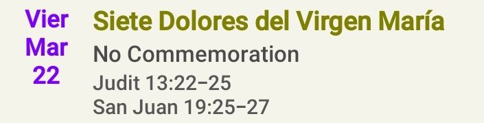 Junto a la cruz de Jesús estaban su madre y la hermana de su madre, María, mujer de Clopás, y María Magdalena. Jesús, viendo a su madre y junto a ella al discípulo a quien amaba, dice a su madre: «Mujer, ahí tienes a tu hijo.» Luego dice al discípulo: «Ahí tienes a tu madre.» Y desde aquella hora el discípulo la acogió en su casa.