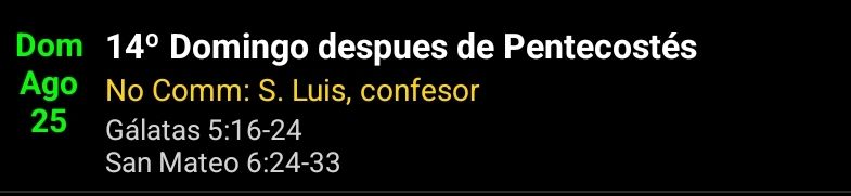 «Nadie puede servir a dos señores; porque aborrecerá a uno y amará al otro; o bien se entregará a uno y despreciará al otro. No podéis servir a Dios y al Dinero. «Por eso os digo: No andéis preocupados por vuestra vida, qué comeréis, ni por vuestro cuerpo, con qué os vestiréis. ¿No vale más la vida que el alimento, y el cuerpo más que el vestido? Mirad las aves del cielo: no siembran, ni cosechan, ni recogen en graneros; y vuestro Padre celestial las alimenta. ¿No valéis vosotros más que ellas? Por lo demás, ¿quién de vosotros puede, por más que se preocupe, añadir un solo codo a la medida de su vida? Y del vestido, ¿por qué preocuparos? Observad los lirios del campo, cómo crecen; no se fatigan, ni hilan. Pero yo os digo que ni Salomón, en toda su gloria, se vistió como uno de ellos. Pues si a la hierba del campo, que hoy es y mañana se echa al horno, Dios así la viste, ¿no lo hará mucho más con vosotros, hombres de poca fe? No andéis, pues, preocupados diciendo: ¿Qué vamos a comer?, ¿qué vamos a beber?, ¿con qué vamos a vestirnos? Que por todas esas cosas se afanan los gentiles; pues ya sabe vuestro Padre celestial que tenéis necesidad de todo eso. Buscad primero el Reino de Dios y su justicia, y todas esas cosas se os darán por añadidura.