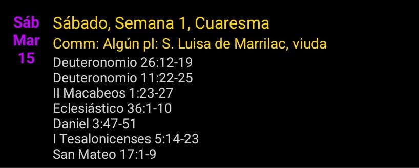 Seis días después, toma Jesús consigo a Pedro, a Santiago y a su hermano Juan, y los lleva aparte, a un monte alto. Y se transfiguró delante de ellos: su rostro se puso brillante como el sol y sus vestidos se volvieron blancos como la luz. En esto, se les aparecieron Moisés y Elías que conversaban con él. Tomando Pedro la palabra, dijo a Jesús: «Señor, bueno es estarnos aquí. Si quieres, haré aquí tres tiendas, una para ti, otra para Moisés y otra para Elías.» Todavía estaba hablando, cuando una nube luminosa los cubrió con su sombra y de la nube salió una voz que decía: «Este es mi Hijo amado, en quien me complazco; escuchadle.» Al oír esto los discípulos cayeron rostro en tierra llenos de miedo Mas Jesús, acercándose a ellos, los tocó y dijo: «Levantaos, no tengáis miedo.» Ellos alzaron sus ojos y no vieron a nadie más que a Jesús solo. Y cuando bajaban del monte, Jesús les ordenó: «No contéis a nadie la visión hasta que el Hijo del hombre haya resucitado de entre los muertos.»