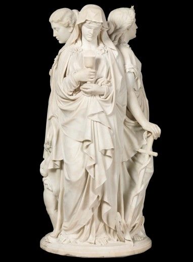 representa las tres virtudes teologales con sus símbolos: la Fe con los ojos vendados y en la mano un cáliz con una sagrada forma, la Esperanza levantando su mirada y con una cruz-ancla símbolo de solidez, fidelidad y también de Cristo, y la Caridad con un pomo en forma de corazón con una llama símbolo del amor, sobre un pedestal circular, sin decoración, diseñado para completar el conjunto.