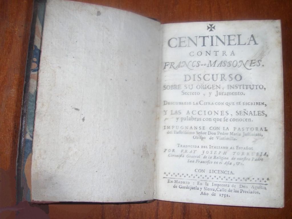 <Comoquiera, el padre Torrubia juzgó conveniente difundir, a manera de antídoto, un libro rotulado Centinela contra francamasones. Discursos sobre su origen, instituto, secreto y juramento. Descúbrese la cifra con que se escriben y las acciones, señas y palabras con que se conocen. Para impugnarlos transcribe literalmente, traducida por él del italiano al castellano, una pastoral de monseñor Justiniani, obispo de Vintimilla>. Pero la Orden que figuraba en la vanguardia de la lucha antimasónica era la del confesor real