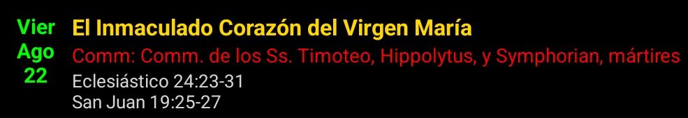 Junto a la cruz de Jesús estaban su madre y la hermana de su madre, María, mujer de Clopás, y María Magdalena. Jesús, viendo a su madre y junto a ella al discípulo a quien amaba, dice a su madre: «Mujer, ahí tienes a tu hijo.» Luego dice al discípulo: «Ahí tienes a tu madre.» Y desde aquella hora el discípulo la acogió en su casa.