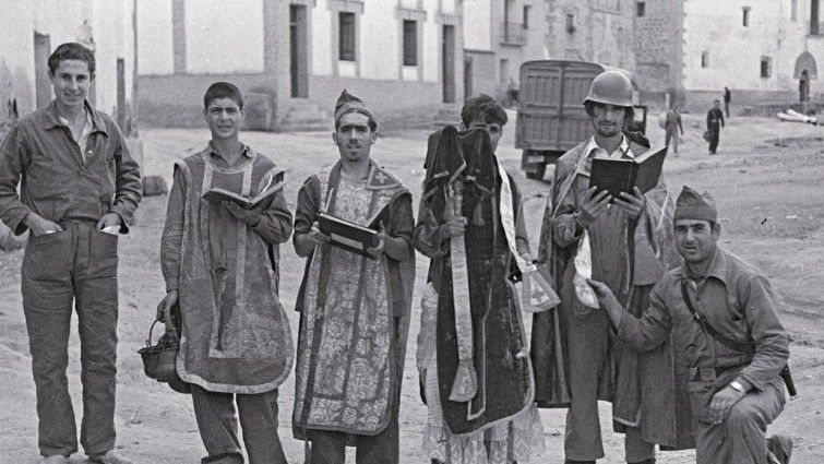 Milicianos rojos divirtiéndose tras saquear la sacristía de una iglesia (Guerra Civil española 1936-39)
