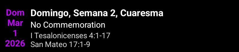 Seis días después, toma Jesús consigo a Pedro, a Santiago y a su hermano Juan, y los lleva aparte, a un monte alto. Y se transfiguró delante de ellos: su rostro se puso brillante como el sol y sus vestidos se volvieron blancos como la luz. En esto, se les aparecieron Moisés y Elías que conversaban con él. Tomando Pedro la palabra, dijo a Jesús: «Señor, bueno es estarnos aquí. Si quieres, haré aquí tres tiendas, una para ti, otra para Moisés y otra para Elías.» Todavía estaba hablando, cuando una nube luminosa los cubrió con su sombra y de la nube salió una voz que decía: «Este es mi Hijo amado, en quien me complazco; escuchadle.» Al oír esto los discípulos cayeron rostro en tierra llenos de miedo Mas Jesús, acercándose a ellos, los tocó y dijo: «Levantaos, no tengáis miedo.» Ellos alzaron sus ojos y no vieron a nadie más que a Jesús solo. Y cuando bajaban del monte, Jesús les ordenó: «No contéis a nadie la visión hasta que el Hijo del hombre haya resucitado de entre los muertos.»