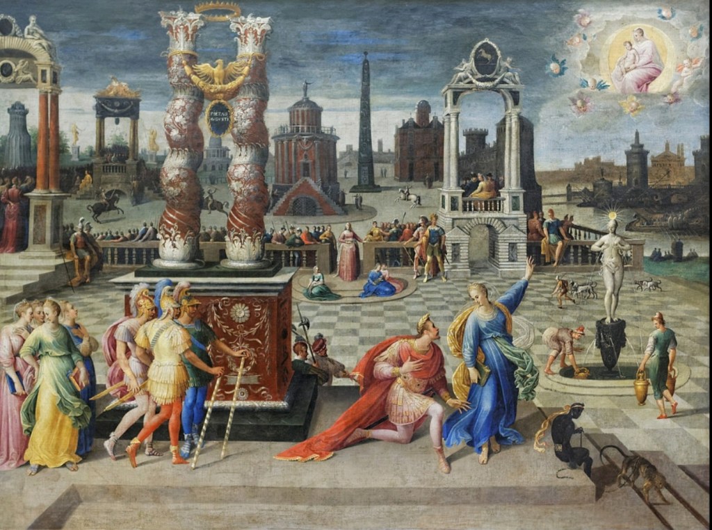 Augusto, arrodillado ante ella, la aparición de la Virgen sosteniendo el Niño que ahora adoraría el pueblo romano